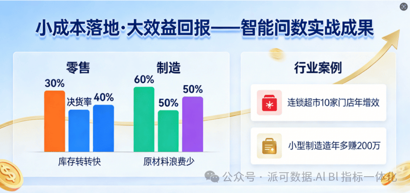 智能问数是通过自然语言交互实现数据查询的技术,让非技术人员也能快速获取业务洞察。落地分三步:1)统一指标口径,建立标准化指标体系;2)构建数据模型和知识库,将业务语言转化为数据逻辑;3)搭建智能平台,支持多角色、多场景的数据应用。典型案例显示,零售企业库存周转提升30%,制造企业原材料浪费减少50%。该方法无需复杂技术,小成本即可实现数据驱动决策,显著提升运营效率。