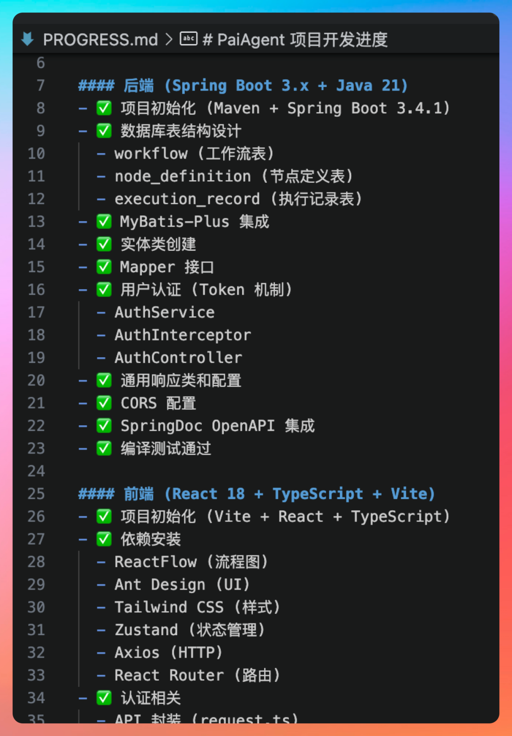 来看一下,第一阶段,完成了基础框架的搭建,后端用的是 Spring Boot 3.x + Java 21 + MyBatis-Plus,前端用的是 React 18 + TypeScript + Vite + ReactFlow。