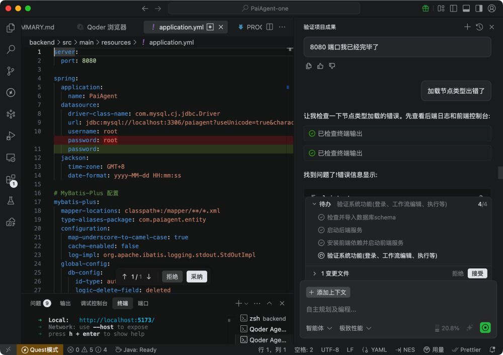 如果出现错误,我们可以直接将错误扔给 Qoder,比如说“加载节点类型出错了”,他会自动帮我们修复。比如说数据库密码忘记配置了,他会在 application.yml 文件中帮我们添加上。