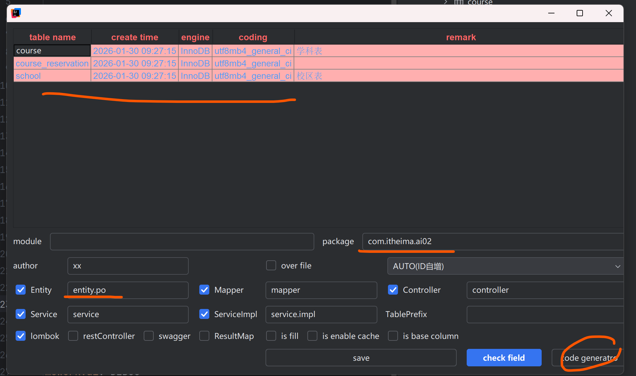 ④基于MybatisPlus的CRUD的基础代码(po里面的三张表)学科表 校区表 课程预约表