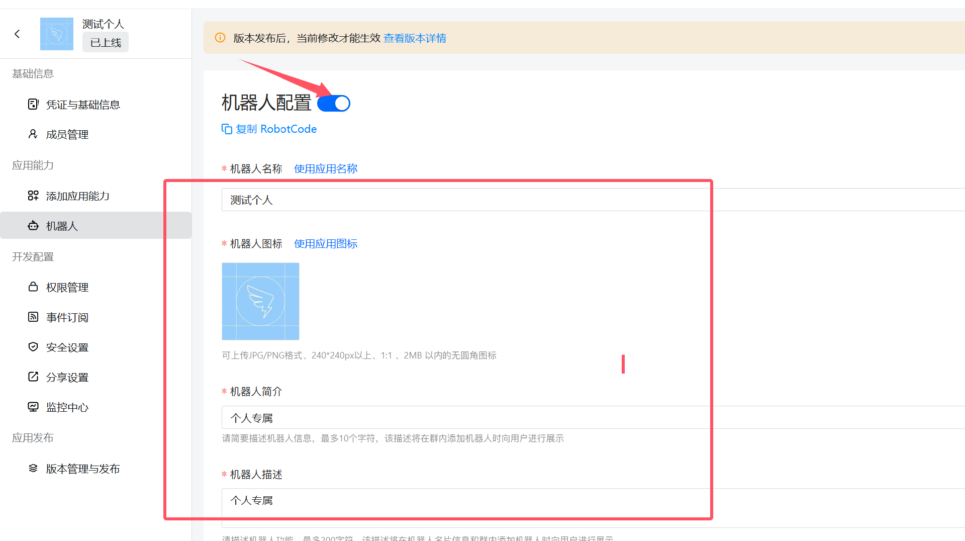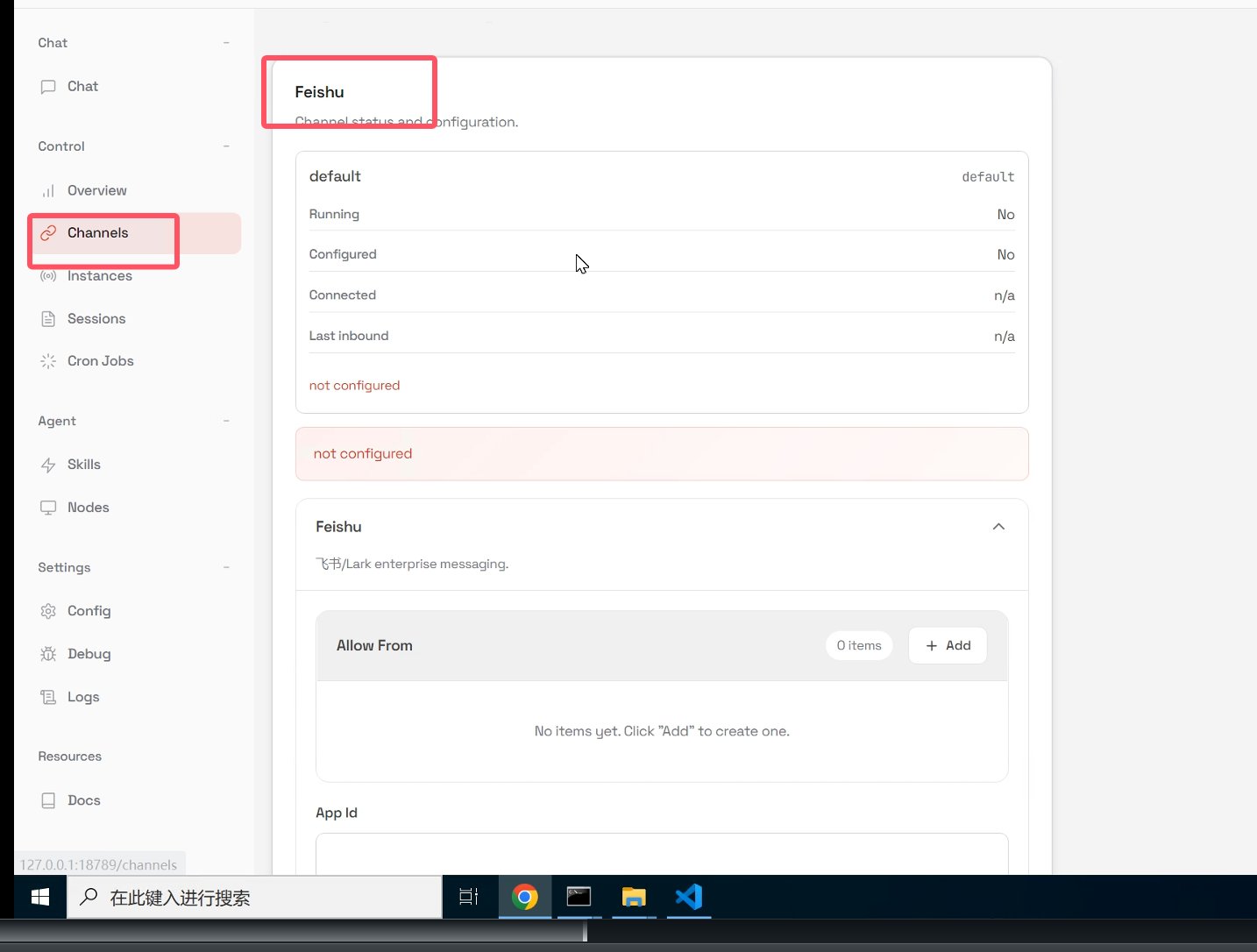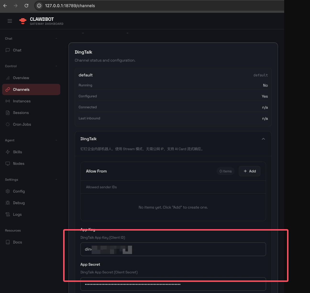 3、复制应用凭证粘贴到openclaw-channels栏中点击保存