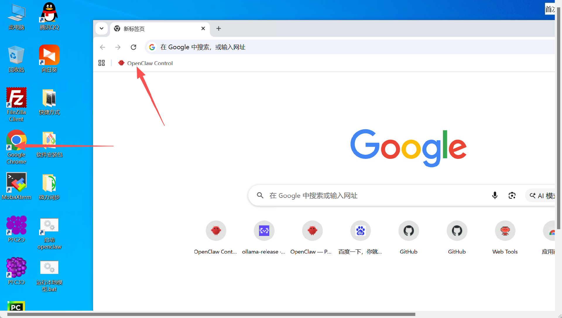 看见绿字我们就可以启动了,打开浏览器,点击书签中的openclaw图标,我们就进入到openclaw界面