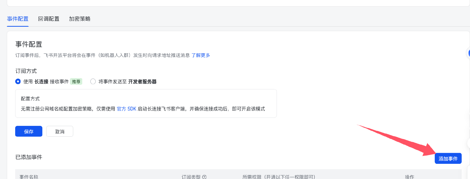 5、配置事件:选择长连接