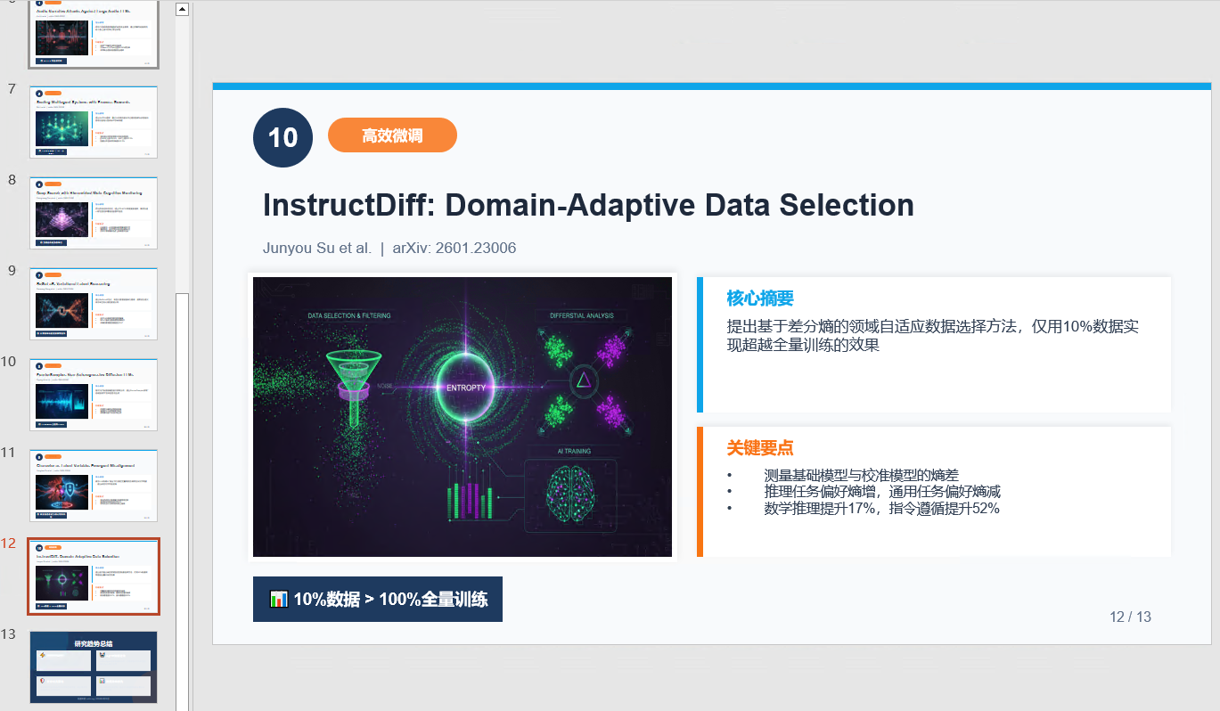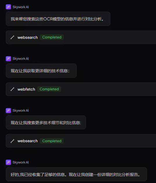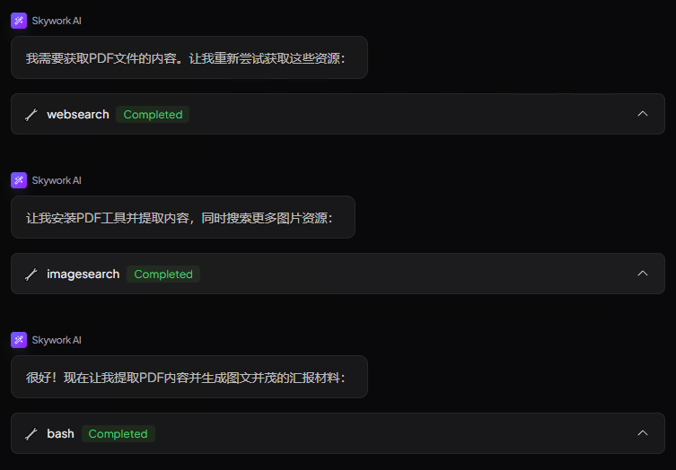 结果:Skywork 自动在线阅读(甚至是线上的 PDF,缺少 PDF 工具时,它还会自动安装),提炼关键信息,生成结构清晰的汇报文档,还标注了"这段数据来源"