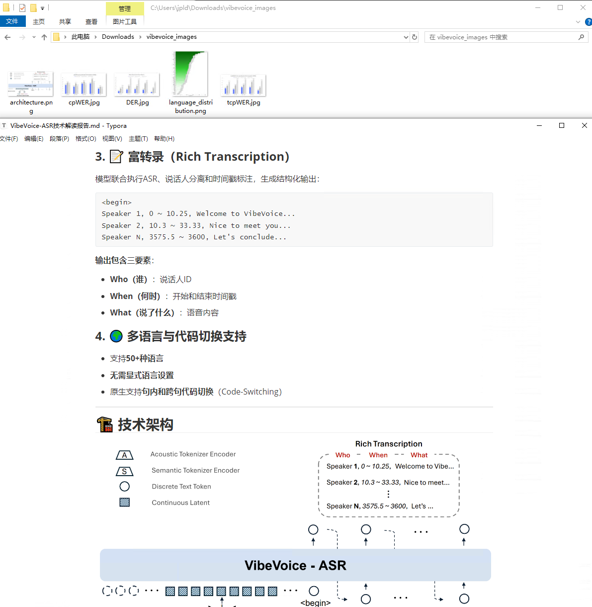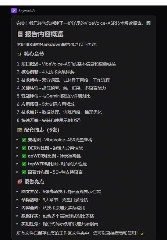 一句话指令:“读取这些链接内容,帮我做一份汇报材料,图文并茂解读 vibevoice 这个模型,markdwon 格式保存在本地。”