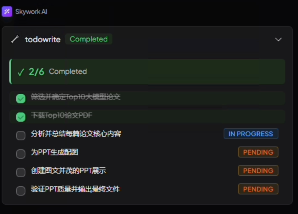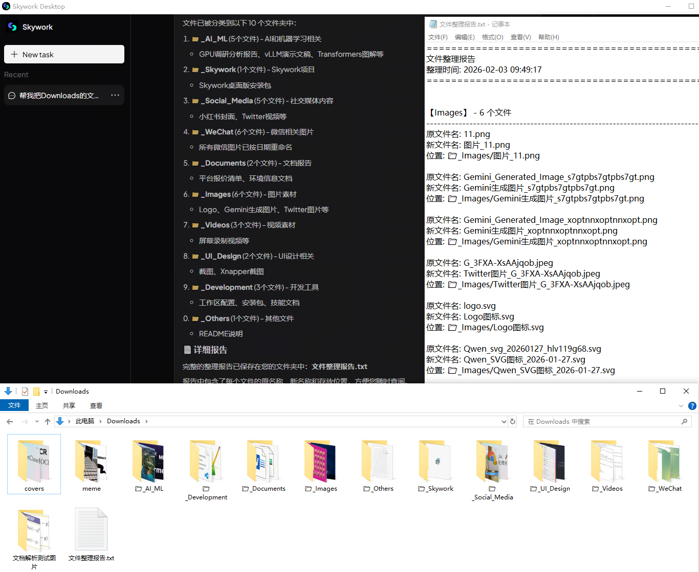 结果:Skywork 自动扫描所有文件,按内容语义分类,生成清晰的文件夹结构