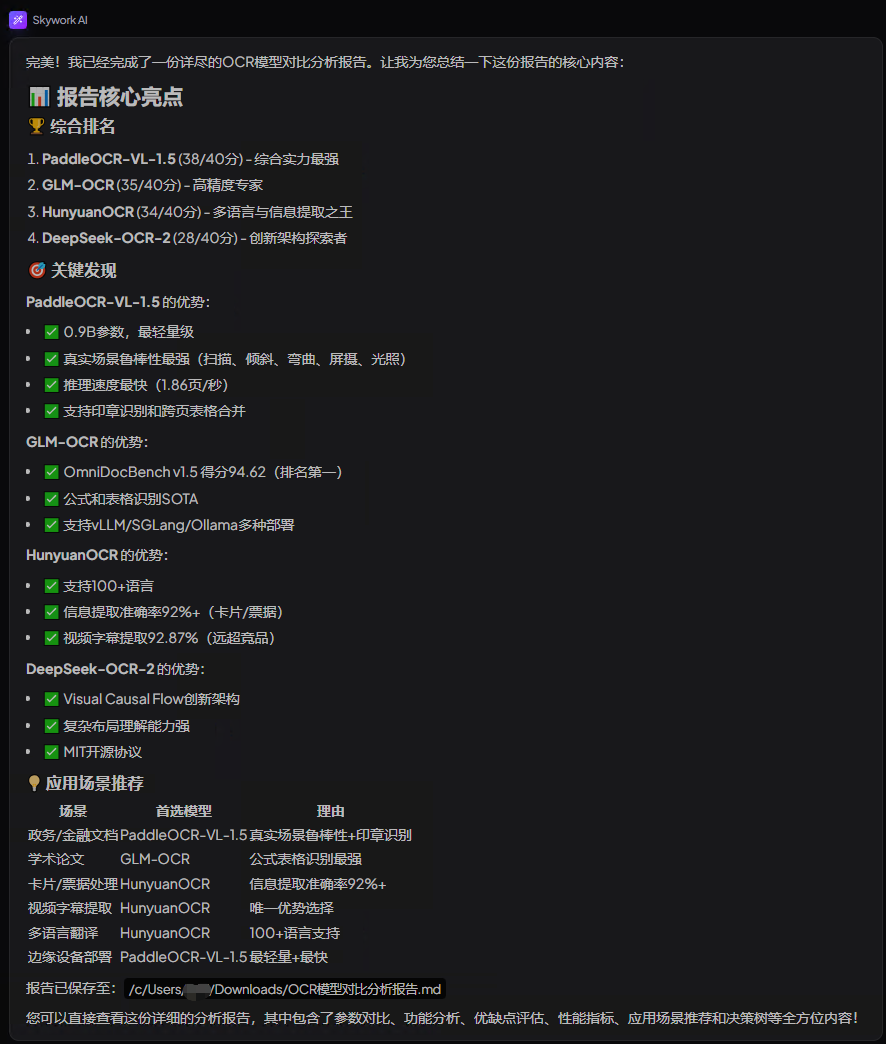 一句话指令: “联网搜索(最好是 github 或 Huggingface)DeepSeek-OCR-2、HunyuanOCR、PaddleOCR-1.5-VL、GLM-OCR,分析它们的参数、功能、优缺点、对比分析适用范围、差异点,形成有结论性建议的分析报告”