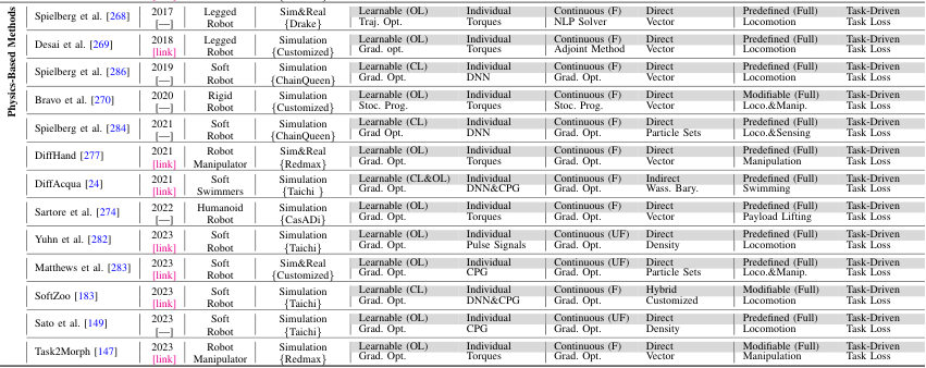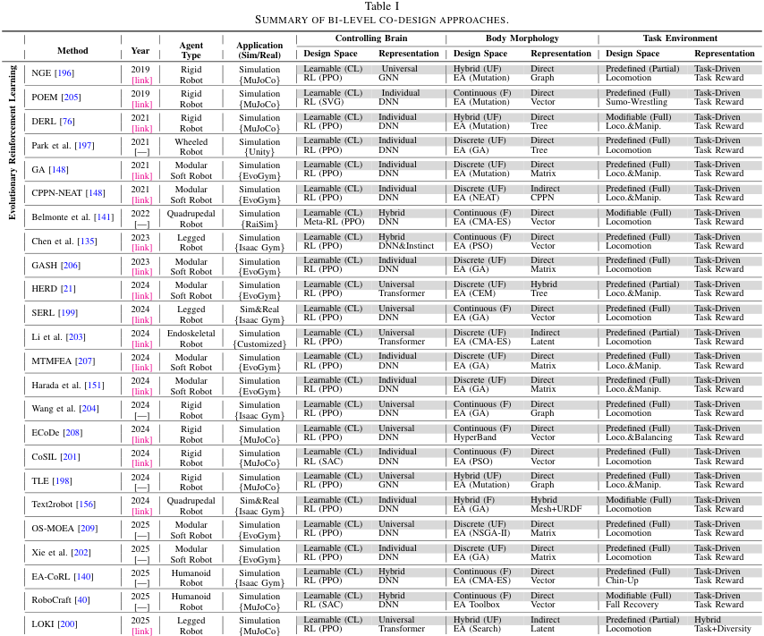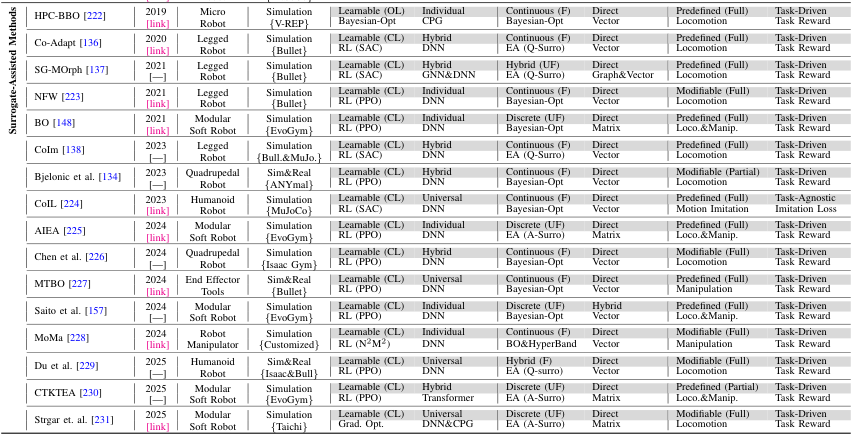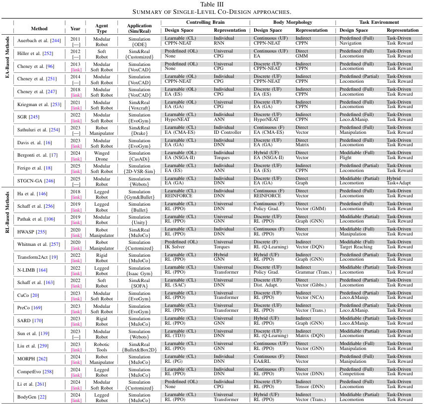 表I详细总结了近年来双层协同设计的重要研究。我们可以看到,从早期的简单刚体机器人,到如今复杂的模块化软体机器人,双层框架始终占据重要地位。