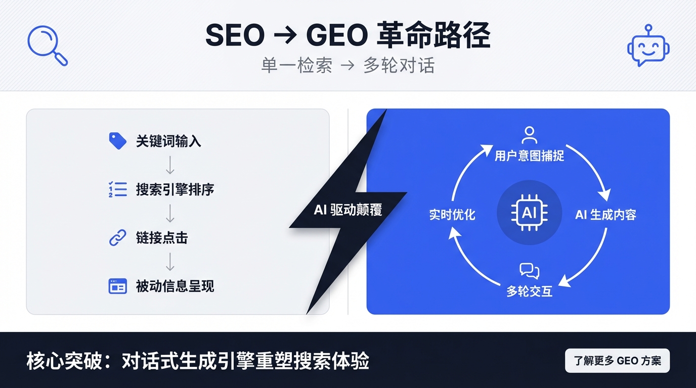 GEO(生成式引擎优化)是AI时代的营销新范式,它超越了传统SEO的关键词排名,专注于在AI对话环境中,通过内容整合与结构化数据应用,系统性地管理品牌的数字身份和认知。SEO聚焦于“搜索”,而GEO聚焦于“生成与交互”。