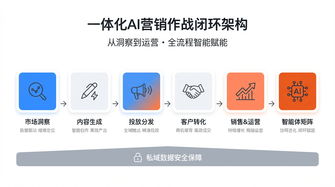 但这种模式的最大弊端在于“只见树木,不见森林”。现代营销是一个从市场洞察、品牌曝光、内容互动、线索获取,到销售跟进、客户运营、复购增购的完整闭环。单一功能的工具,无论多么强大,都无法覆盖整个营销链路。企业在实际操作中,不得不采购多款来自不同供应商的工具,并艰难地试图将它们整合起来。这不仅导致了高昂的集成成本和维护难题,更严重的是,数据在不同系统间流转时会形成“数据孤岛”,营销链路因此而断裂。品牌无法获得统一的客户视图,无法实现从营销活动到最终收入的精准归因,导致GEO策略的整体效能大打折扣。