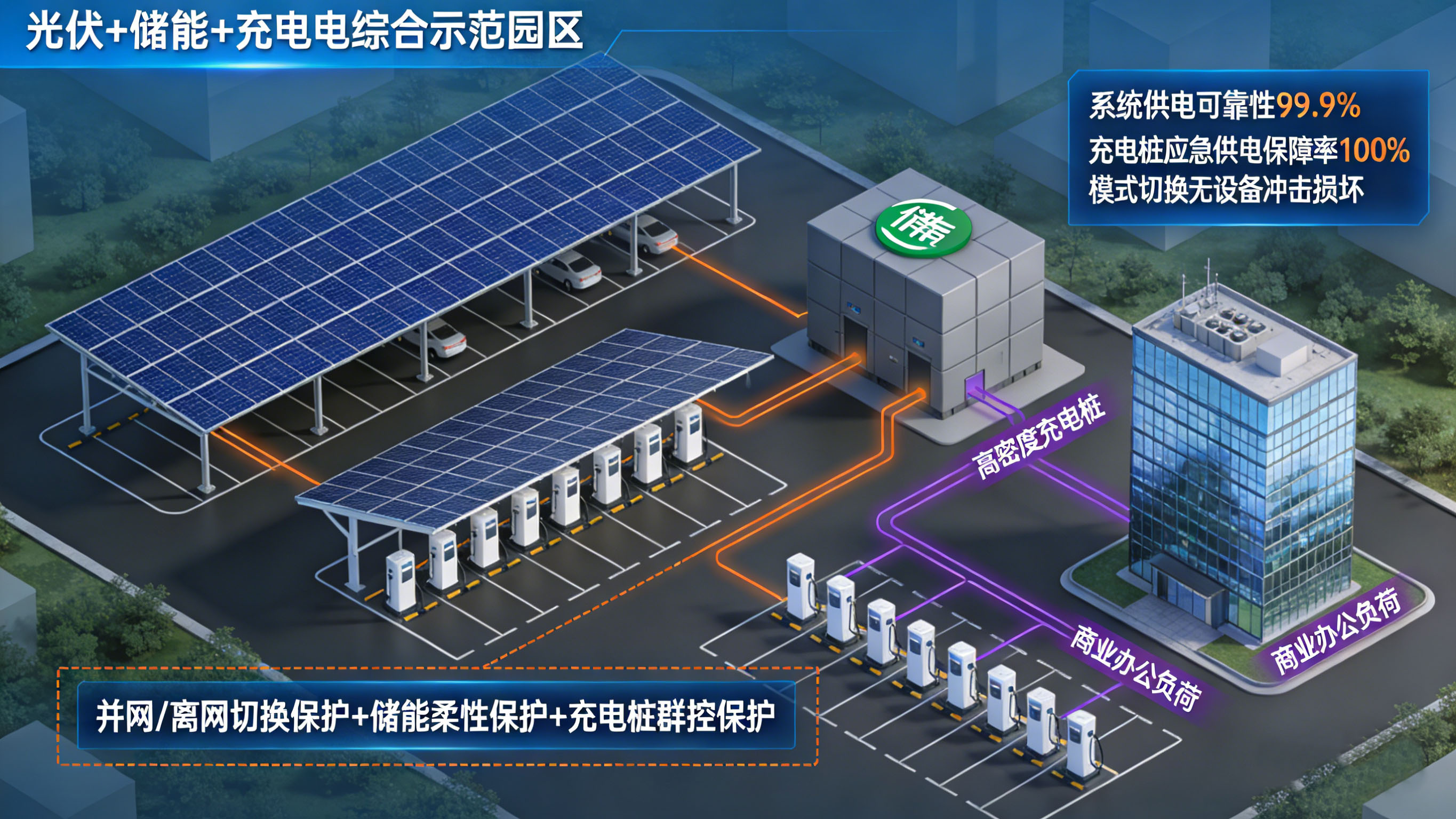 保护技术应用:采用“并网/离网切换保护+储能柔性保护+充电桩群控保护”组合方案,通过软切换技术保障模式切换平稳,储能柔性保护稳定电压,充电桩群控保护避免多桩同时启动导致的冲击电流。