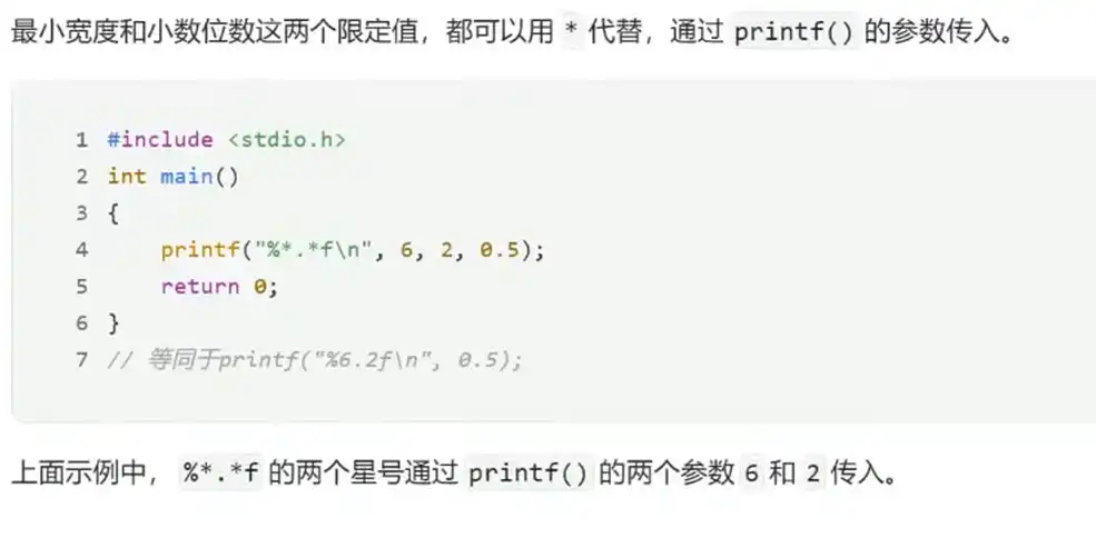最小宽度与小数位数两个限定值,可以用*代替,通过printf传入