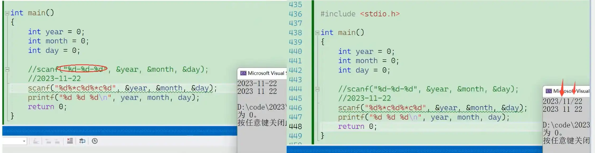 由于每个人输入的方式不一样(比如:1994/3/5,1994/3/5),为了避免这种情况,scanf()提供了赋值忽略符。只要把*放在任何占位符%的后面,该占位符就不会返回值,解析后被丢弃