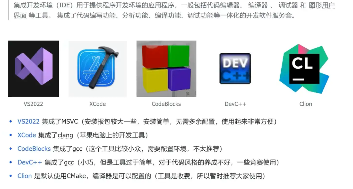 集成开发环境集成了编译器、编辑器、调试器等,比如VS2022集成了msvc