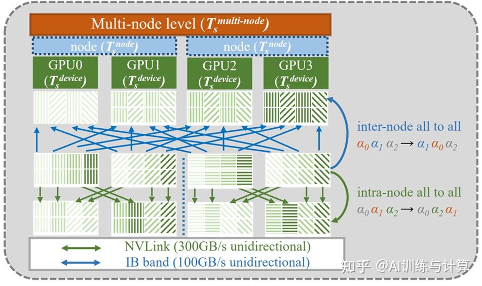 同时,考虑到节点内和节点间带宽的差异,我们提出了混合通信算法。计算硬件平台中节点内的 GPU 通过 NVLink 连接,带宽为 300 GB/s,而节点间通过 InfiniBand 通信,只有 100 GB/s 的带宽且同时由节点内 8 个 GPU 共享。因此,节点间通信比节点内通信慢一个数量级,如下图所示: