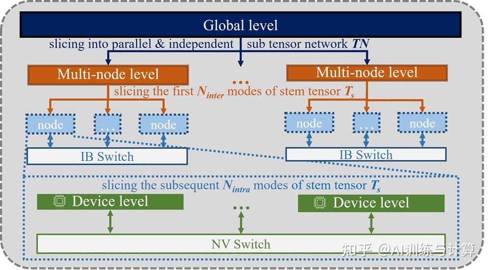 “主干路径”(stem path) 指的是张量网络中一系列计算量非常大的节点,这些节点成为整体任务计算量和内存开销的主要瓶颈。“主干张量”(stem tensor)是指与主路径相关的张量。图中的虚线绿色矩形表示了不同设备之间的并行划分方式。这里,主干张量被进一步分割成适合于设备级别(device level)的大小。