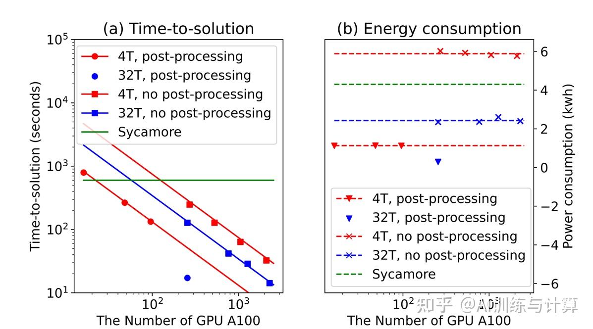如上表所示,对于 32TB 张量网络,未使用后选择处理算法(简称 no-PP)的情况下,我们用 2304 个 GPU 在 14.22 秒内达到了与 Sycamore 相同的 0.02%保真度,能耗为 2.39 kWh;而使用后选择处理算法(简称 PP)后,我们的方案在时间 17.18 秒内完成了该任务,经过后处理后 XEB 同样达到 0.02%,能耗仅为 0.29 kWh。无论是在速度还是能效效率上,我们的模拟器均超越了谷歌的量子处理器 Sycamore 所需的 600 秒、4.3 kWh,是量子计算研究的一个重要里程碑。