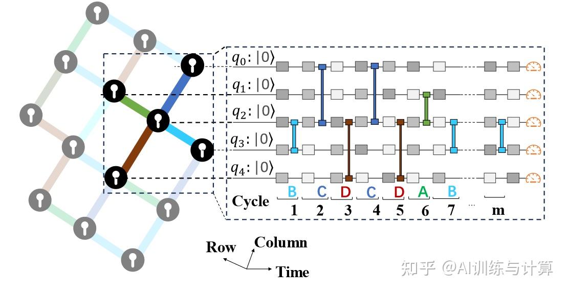 在电路图中,不同的门选择用不同灰度的矩形表示。另外,单量子比特门不能按顺序重复;双量子比特门的顺序按照量子比特的排列模式选择,将每个量子比特依次与其四个最近邻量子比特耦合。通过不断的耦合,电路结构将产生一种高度纠缠的量子系统,这使得用经典计算机仿真模拟十分困难。