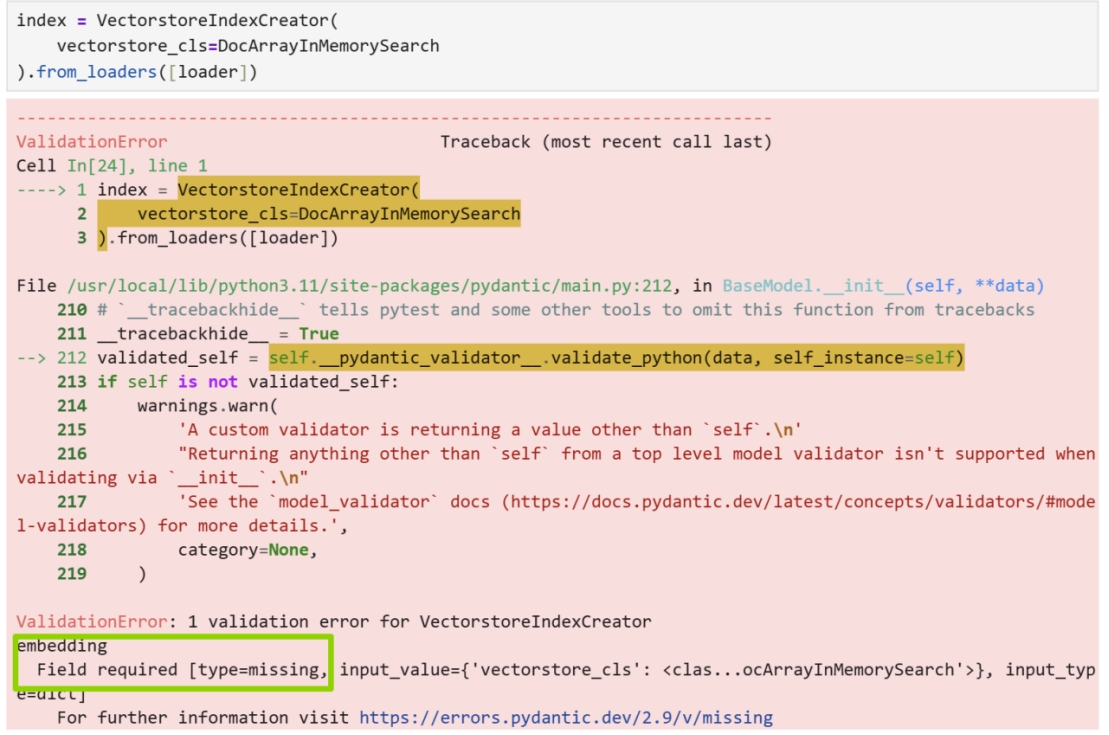 创建 VectorstoreIndexCreator 实例时,只传了 vectorstore_cls 参数,但该类必须指定 embedding(嵌入模型):