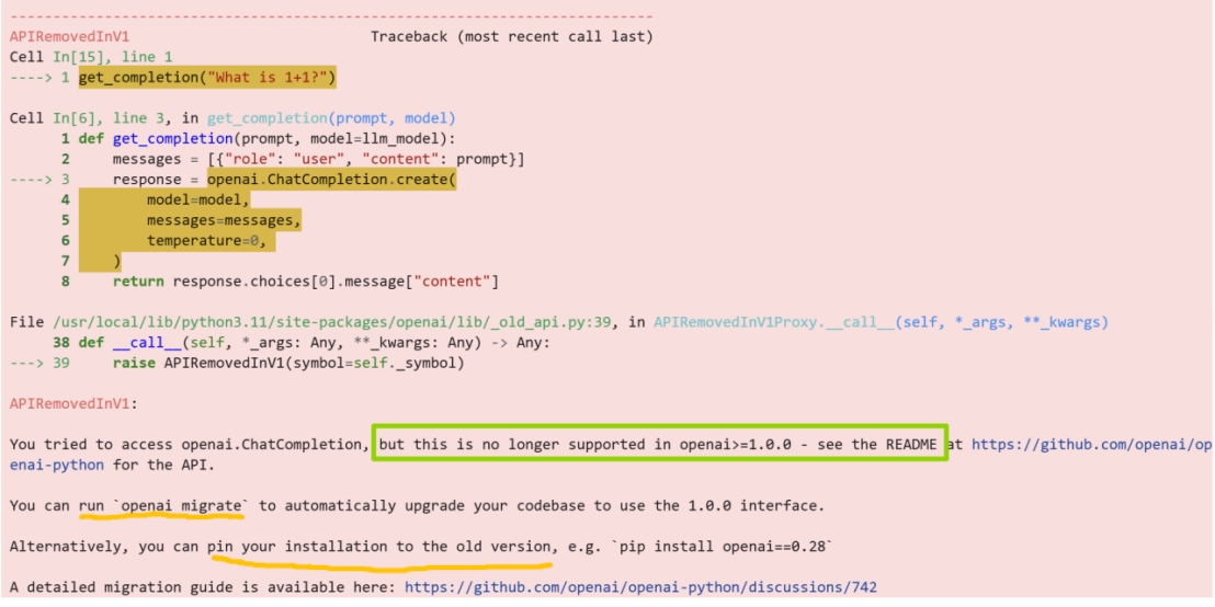 DeepLearning.ai两年前视频里使用的 openai 库版本 ≥1.0.0,而代码中调用的 openai.ChatCompletion 是旧版(0.28 及以下)接口,已被移除;