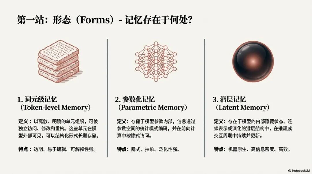 记忆形式指信息在智能体系统中的具体物理承载方式,决定了其存储密度和可访问性。