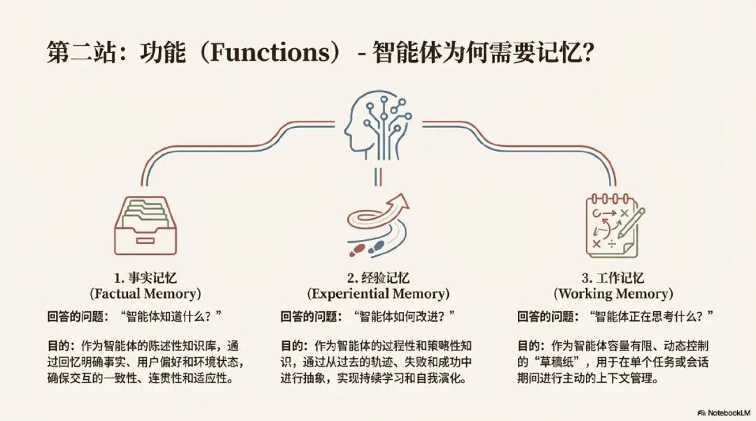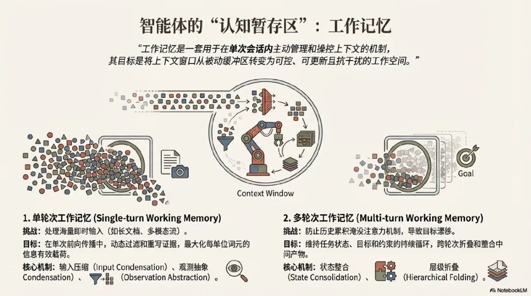 | 上下文工程 | 提示词(Prompt)的短期优化。 | 仅在瞬时上下文窗口内起作用,属于工作记忆的一部分,但并非持久的、自我演化的记忆系统。 |