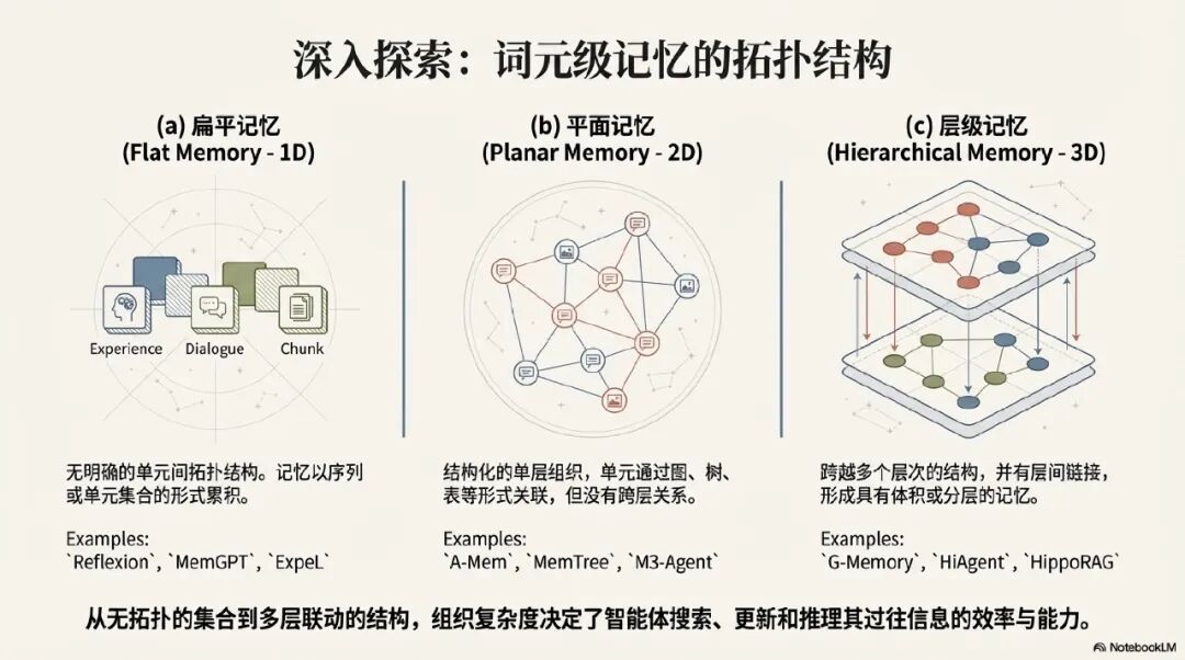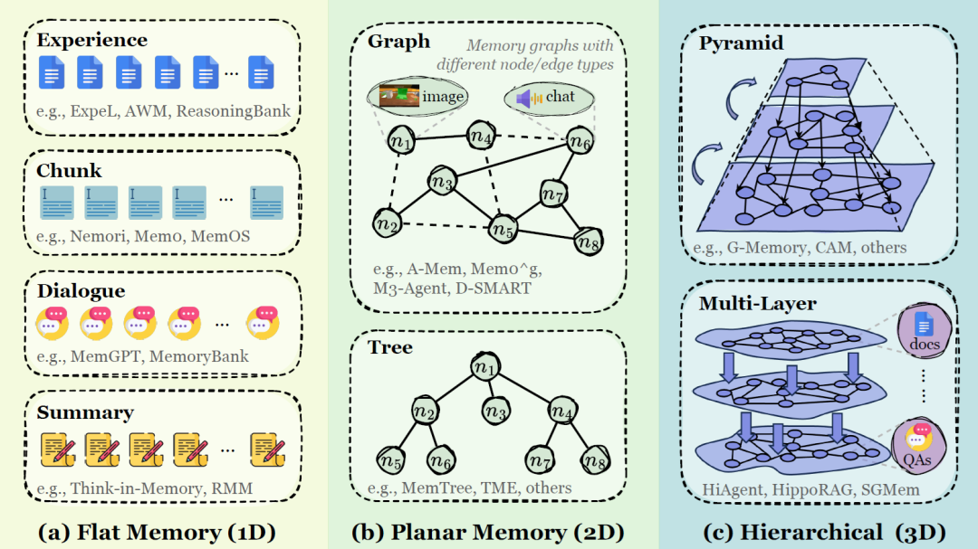 | 令牌级记忆 (Token-level Memory) | 采用原始文本或符号结构存储,是当前最主流的非参数化形式。可分为平面(Flat)存储(如简单日志、向量数据库)和层次(Hierarchical)存储(如MemGPT、LangChain的Memory模块)。 | RAG、向量存储、分层摘要。 | 存储和检索过程可解释,易于实现。 |