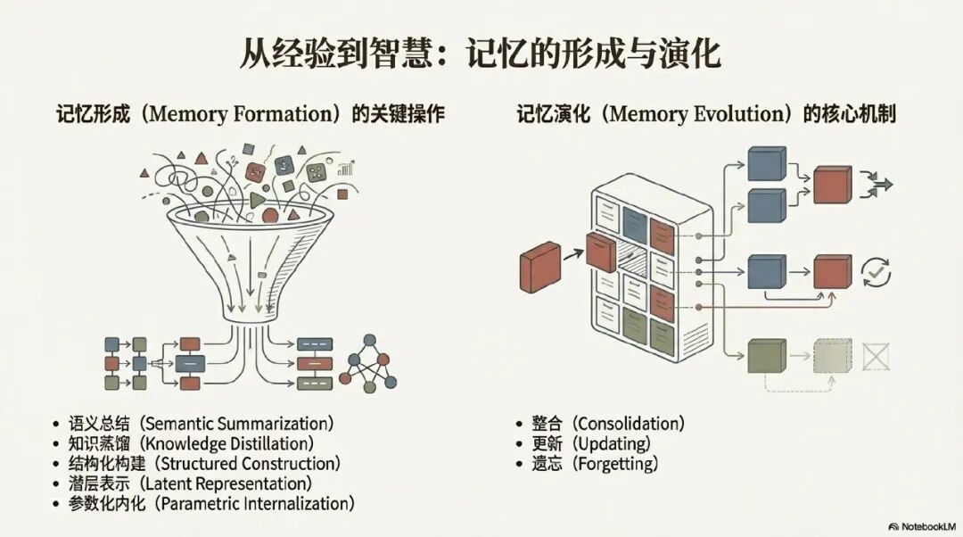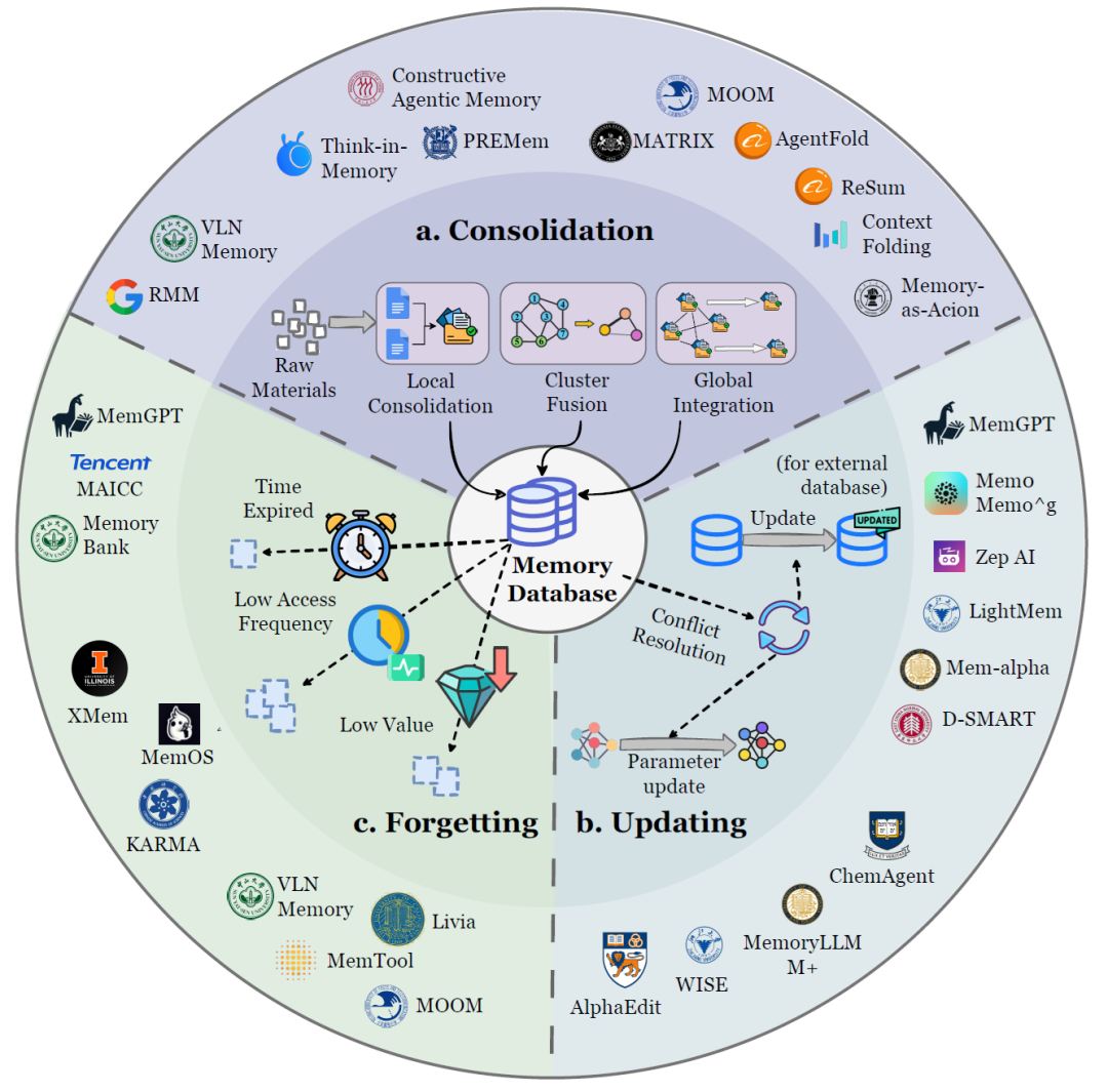 机制:包括记忆巩固(强化重要信息)、记忆更新(解决新旧知识冲突)和遗忘与清理(主动删除陈旧或低价值记忆,防止知识污染和检索效率下降)。