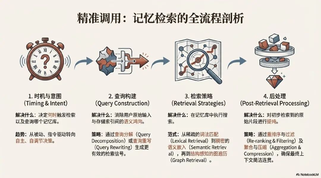 目标:从长期记忆中提取相关信息供当前推理使用(通常通过RAG实现)。