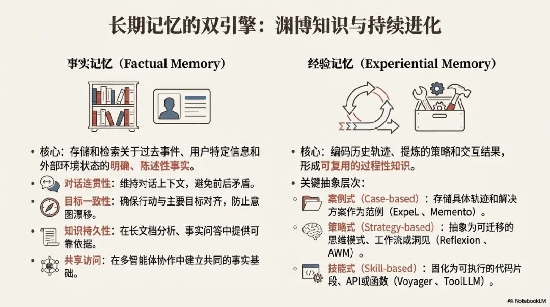 - 经验记忆(Experiential Memory):存储程序性、战略性知识和错误经验(类似人类的程序性记忆),如成功的行动序列、失败的规划、工具的使用方式和反思性见解。