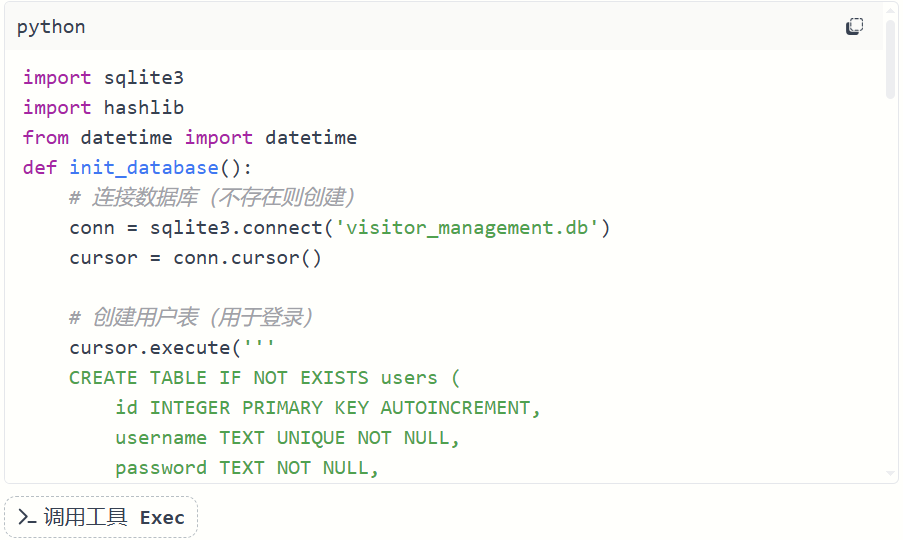 不一会就看到咱们的AI牛马像蜘蛛吐丝般不断输出代码,还贴心的附带了系统简介和使用说明