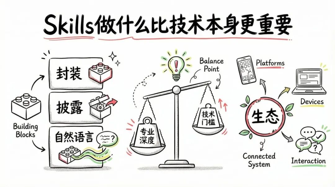 Skills 生态的关键是开发者社区、应用场景、变现方式。只有愿意构建基础设施,有生态,能赚钱的平台才会最大限度激发开发者热情,把私藏的专业知识封装成可复用的模块,最终形成平台红利。