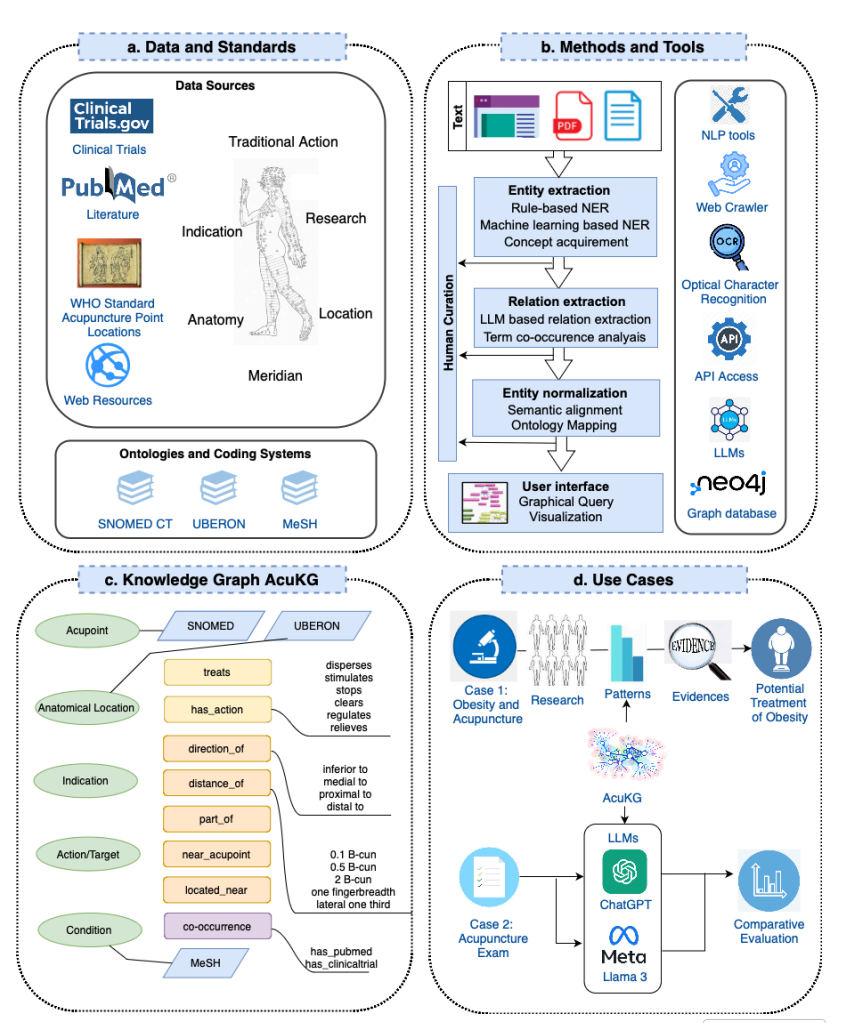 本研究构建了针灸知识图谱(AcuKG),系统性地整合多源数据,涵盖适应症、疗效、临床指南等内容。通过实体识别、语义关系提取等技术,AcuKG不仅增强知识发现能力,还显著提升大语言模型在针灸领域的问答准确性,为临床实践和AI应用提供结构化知识支撑。