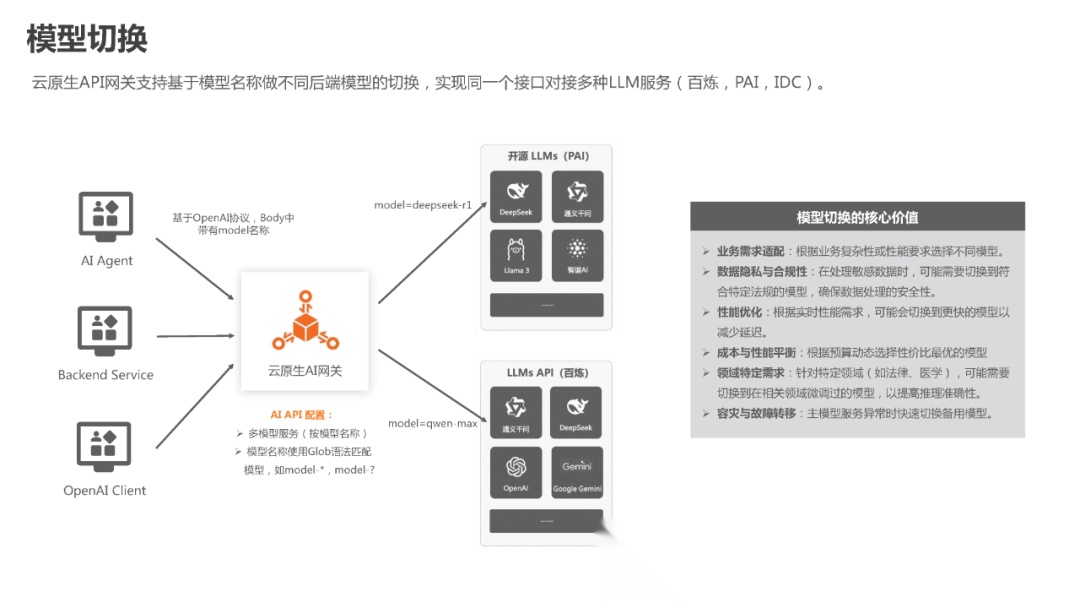 模型网关:基于大模型的应用开发一定需要模型网关,有以下方面的原因:(1)市面上的模型很多,对企业来说,包括自建的模型、外购的第三方模型,什么业务应该路由给哪一个模型,需要考虑业务路由问题。