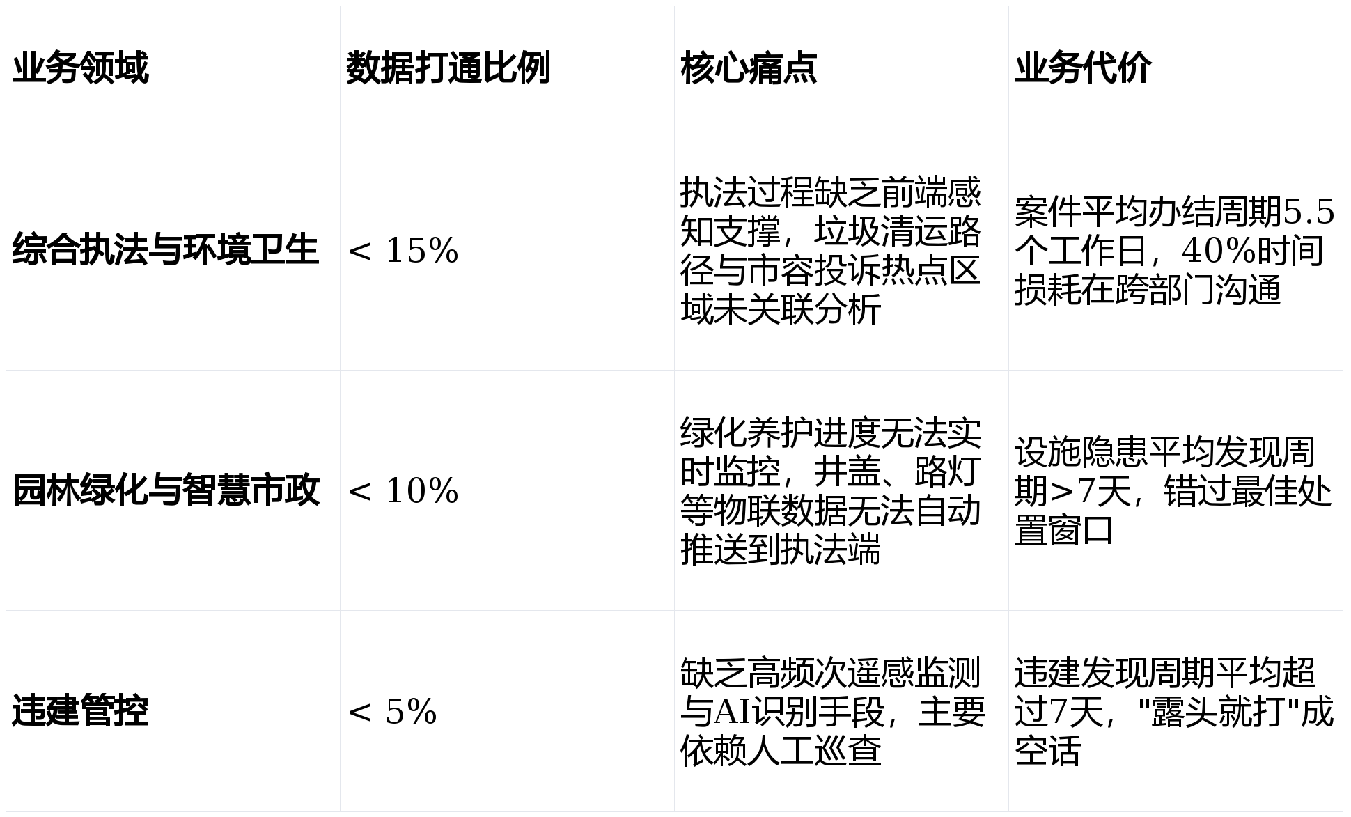 痛点背后逻辑:当前呈现"看得见管不住、管得住看不全"的结构性矛盾。环卫、园林、市政、执法等业务系统各成"烟囱",缺乏统一的运行体征监测中枢,难以支撑跨部门、跨层级的协同指挥调度。
