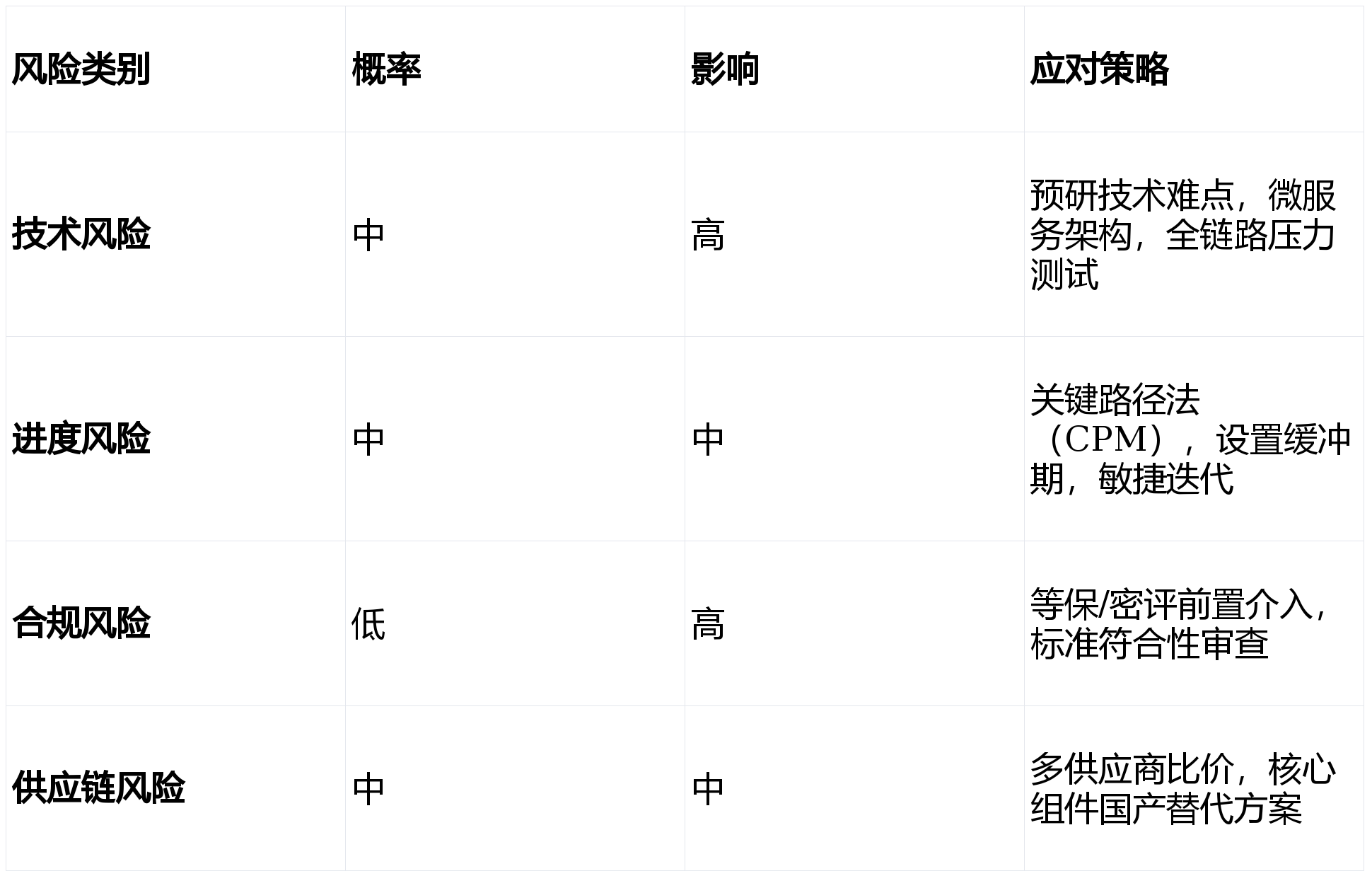 - 采用"2周迭代+月度演示"的敏捷模式,降低需求变更风险