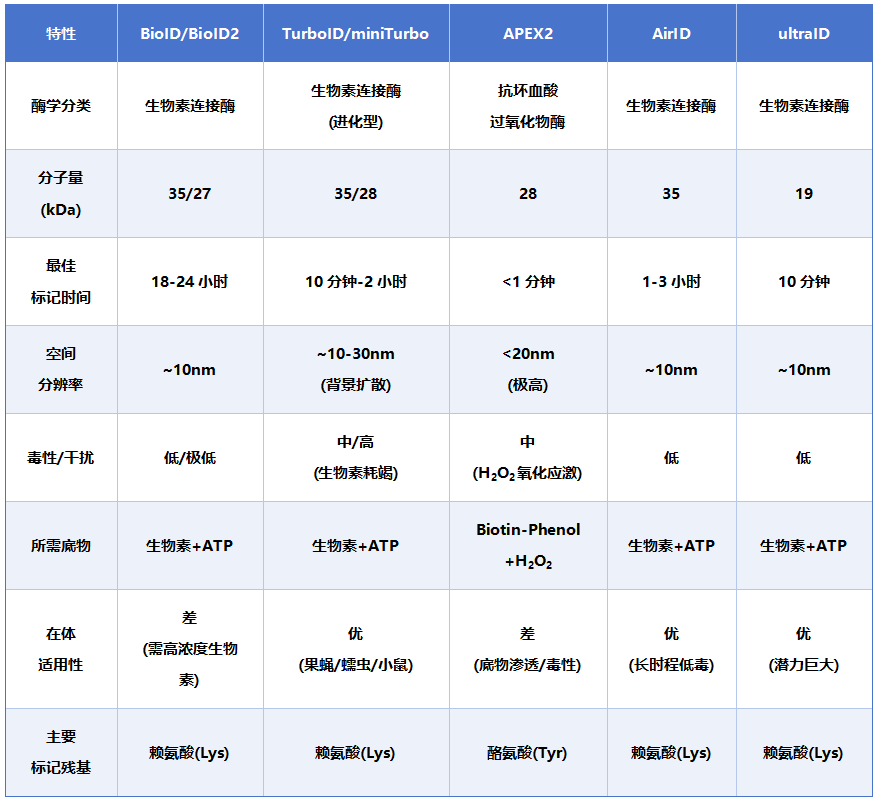 面对邻近标记酶,BioID家族(BioID/BioID2/TurboID/AirID/ultraID)与过氧化物酶家族(APEX/APEX2)各有千秋,其酶学特性、标记效率与应用场景的差异,常令研究者难以抉择。