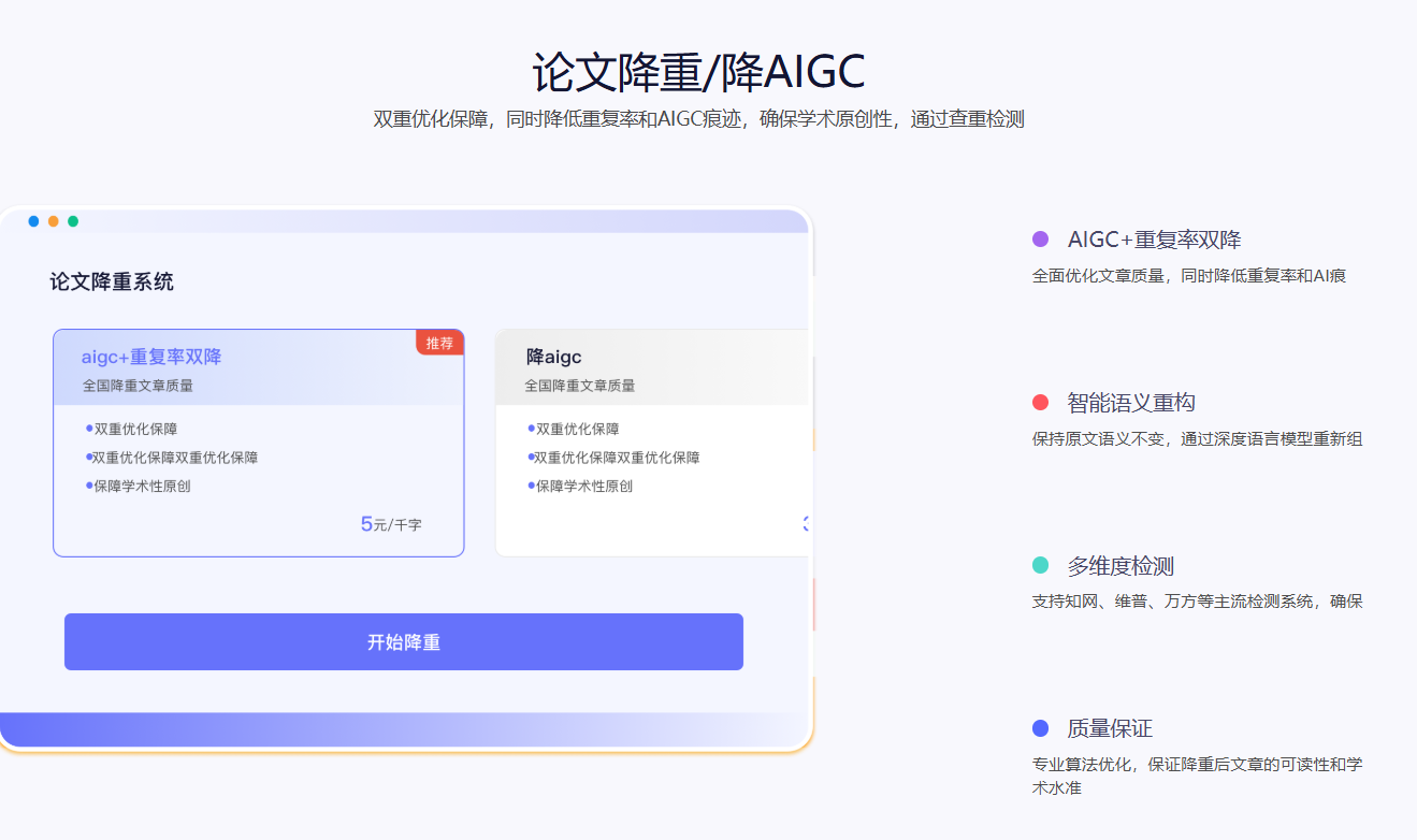 AIGC与重复率双降:综合性高阶方案,同步处理重复率超标与AI痕迹明显的问题,适用于初稿中AI辅助内容较多或引用不当的复杂情况。