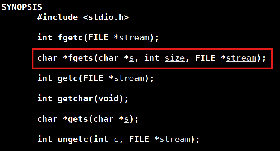 char *fgets(char *s, int size, FILE *stream);