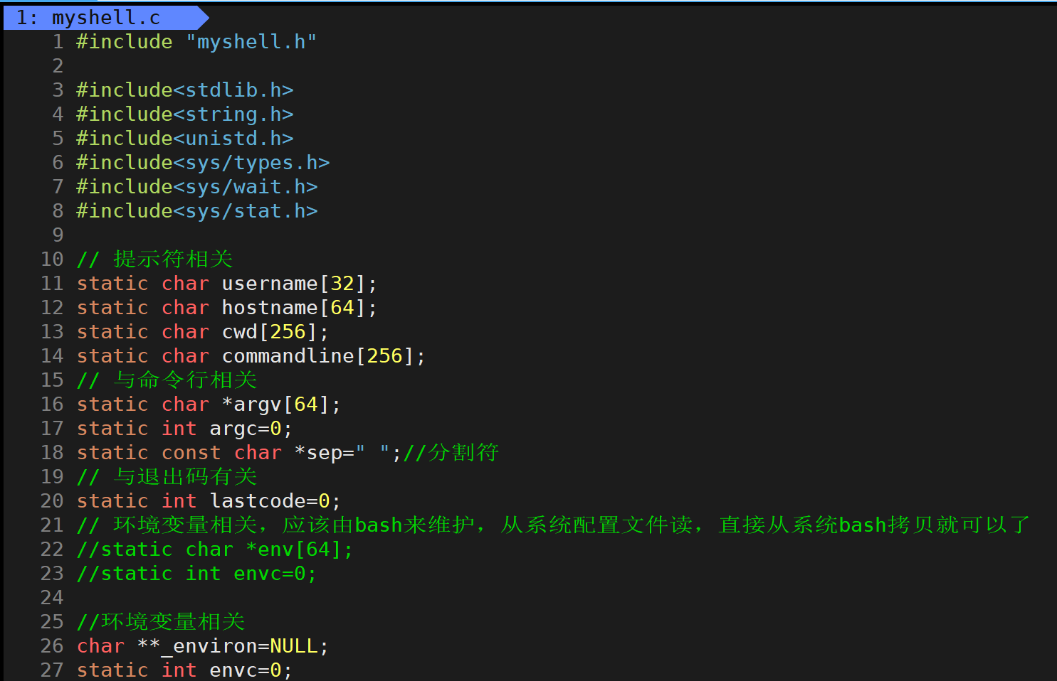 .c文件内部调用,无需对外暴露。用static修饰后,它们会被限制在当前编译单元(文件)内可见,不会导出到全局符号表,既避免了与其他扩展模块(如 shell 插件)的命名冲突,也保证了 shell 核心逻辑的封装性。 -