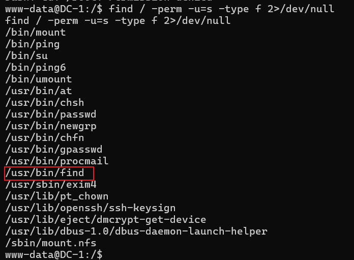 这里发现设置了SUID的有/usr/bin/find,所以可以尝试使用/usr/bin/find命令进行提权