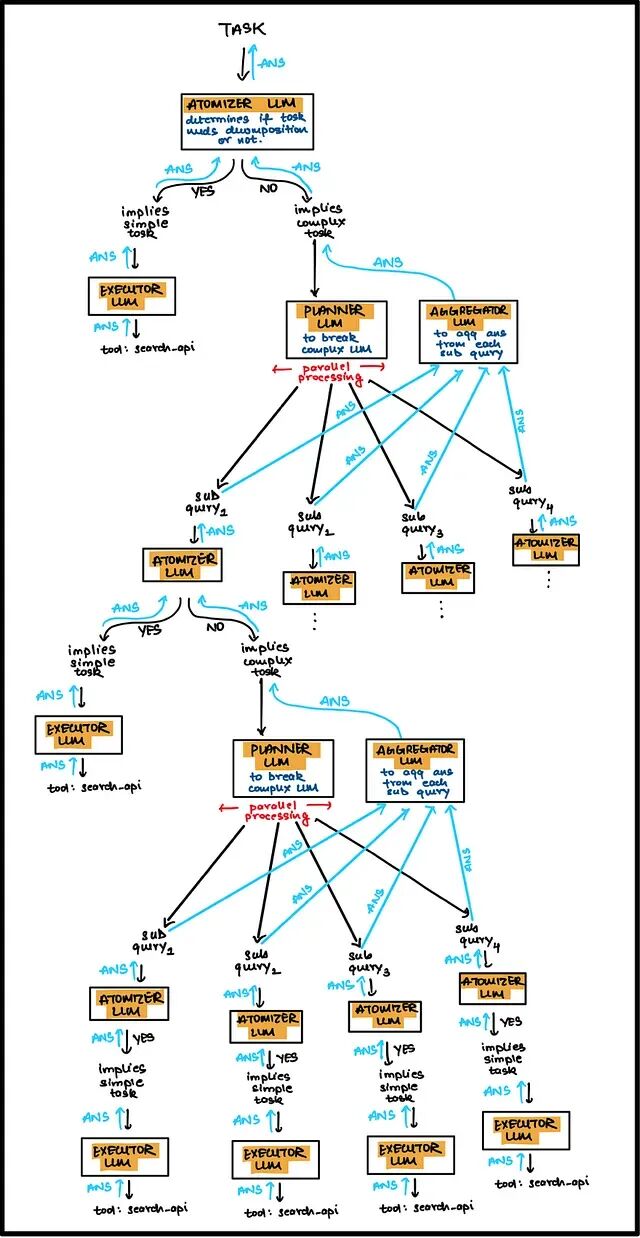 ROMA的核心思想是:把复杂问题递归地分解成子问题,每个子问题再独立处理。和普通的并行拆分不同,ROMA的子问题之间可以有依赖关系——某个子问题的答案可能是另一个子问题的输入。这种设计更符合复杂研究任务的实际结构。
