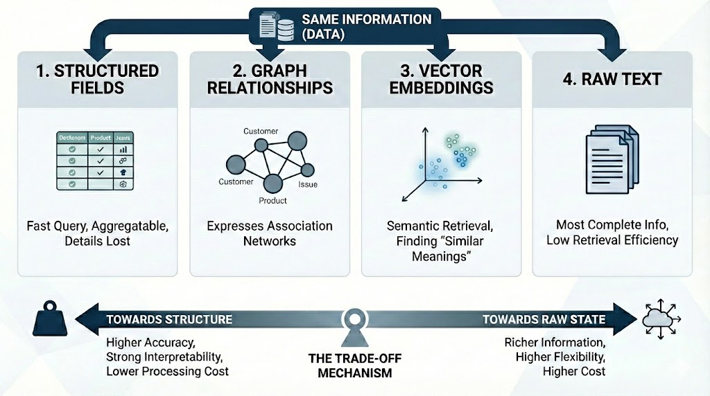 不同形态有不同权衡。越靠近结构化,准确率越高、可解释性越强、处理成本越低;越靠近原始态,信息越丰富、灵活性越高,但成本也越高。