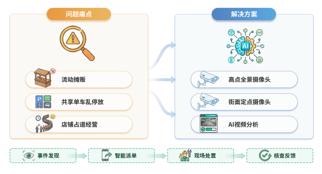 场景描述:商业街区、交通枢纽周边常出现流动摊贩、共享单车乱停放、店铺占道经营等问题,这类问题反复性强、处置频次高,传统模式下需要大量人力巡查,管理成本高、效率低,也是基层治理的常见痛点。