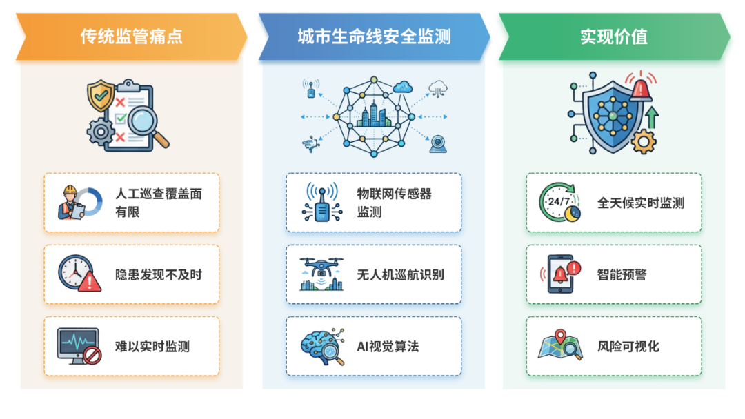 场景描述:燃气管道、桥梁隧道、防汛设施、老旧房屋等城市生命线和基础设施,存在泄漏、内涝、坍塌等安全风险,这类风险隐蔽性强、危害大,传统巡检模式依赖人工定期排查,难以及时发现早期隐患,极易引发安全事故。