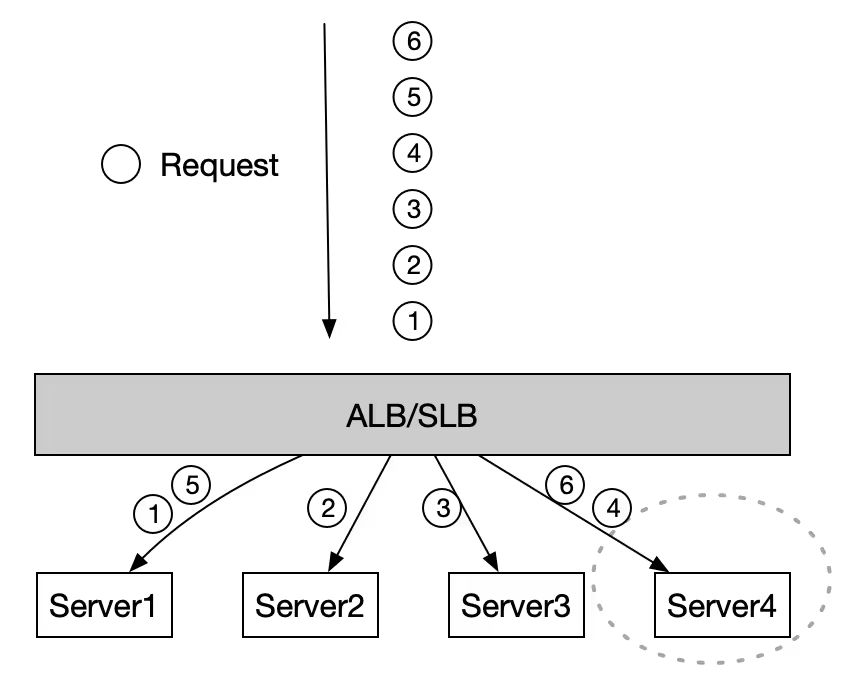 顾名思义,为连接排空能力,作为优雅关闭使用。优雅关闭的前提是后端服务器可用,如下图中一个ALB后面挂有4个 Server,如果做一个缩容操作移除Server4,对于即将要发给这个Server的Request4和6,在draining配置的时间内(0-900s),Server4还是会对Request做出响应,等到draining时间到达之后才断开连接,注意:draining之后后续的7,8,9等请求都不会再发给Server4了,这也是能排空的前提。在 draining时间之后,剩余连接也会收到RST。