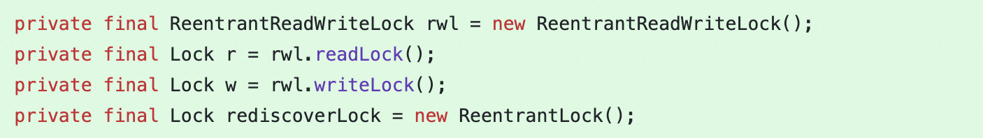 第二层锁使用ReentrantReadWriteLock,主要用来控制连接池的的读写,但加入写锁之后,将会block外部API请求,直到更新完毕连接池,从而实现并发安全访问。