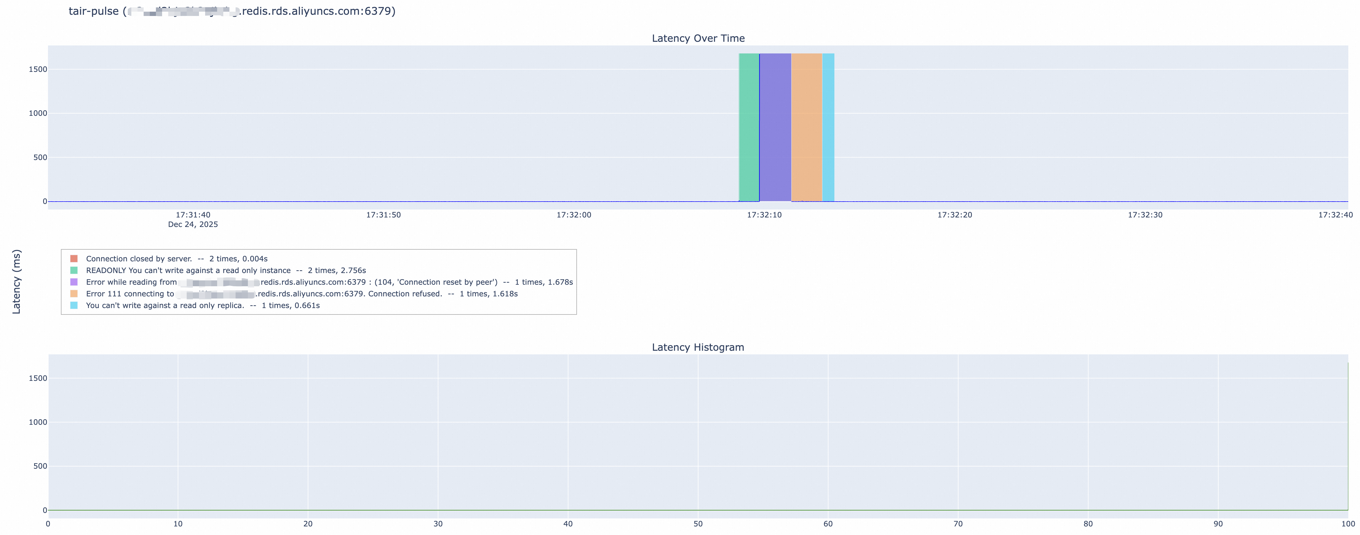 在无感切换上线之后,使用 Tair-pulse[3](一款开源的,可以评测切换期间客户端报错和 RT 的工具)对实例切换期间进行对比测试,可以看到此功能带来两部分的提升: