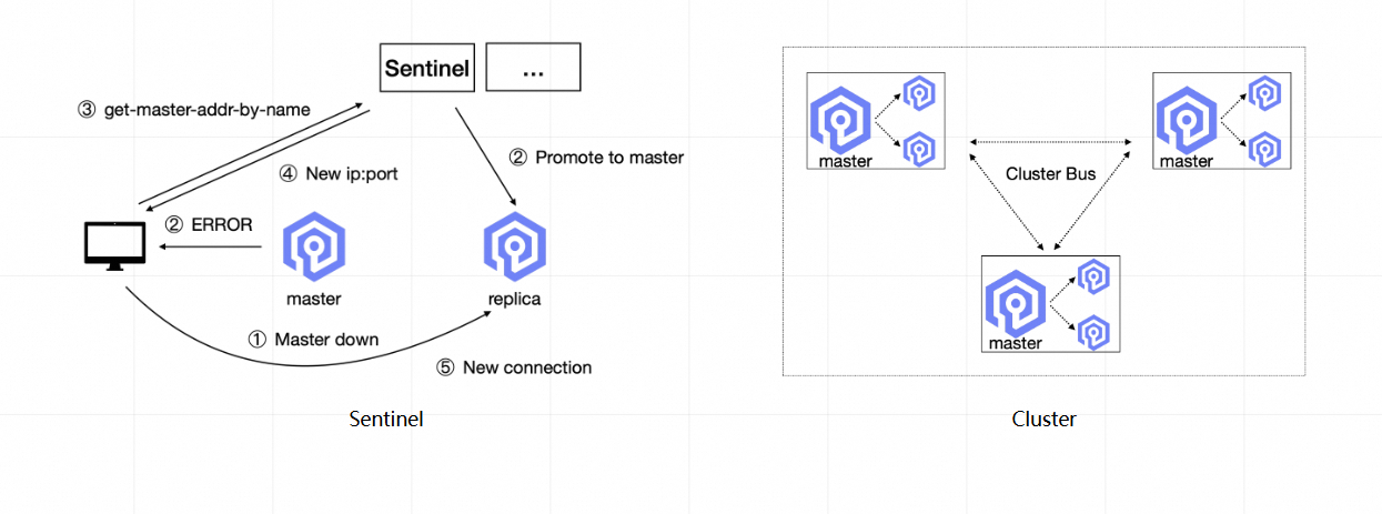 Cluster:Cluster 架构在设计上将分片和高可用整合在一起,集群将全部键空间划分为 16384个槽(slot),由多台 master 节点分担存储与流量,每个 master 可以配置一个或多个 replica 作为副本。当某个 master 出现故障时,其对应的 replica 会在集群内部通过投票选举机制自动提升为新的 master,并接管该 master 负责的所有槽位,从而实现自动主从切换。集群节点之间通过 gossip 协议持续交换心跳和状态信息,分布式维护槽位到节点的映射,客户端在收到 MOVED/ASK 重定向时即可根据最新拓扑重新路由请求。